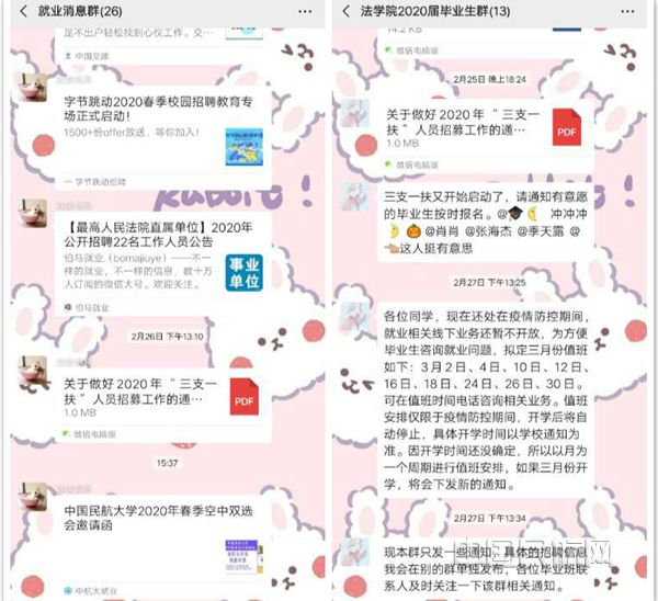 新冠肺炎疫情发生后,学院建立了就业消息群帮助学生获取就业咨询,辅导员经常发送各种就业招聘公司的信息,同时统计了解学生的就业意向。除此之外,教师们还会及时为毕业生做一些心理辅导,鼓励毕业生们看向更广泛的就业市场。法学院2016级学生喻霞说:“学院和老师很关注就业情况和我们的身心健康状况,让我们很有安全感。老师们经常在群里引导我们以正确的就业观选择工作,提醒我们提高自己的甄别能力,同学们也会积极在就业微信群中分享就业信息,有时还会在群里互相加油打气,让我感觉到就业路上不孤单。现实是此案,梦想是彼岸,我们的努力和奋斗是连接它们的桥梁。”