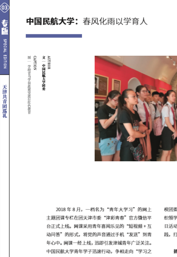 “青年大学习”网上主题活动爆款频出、亮点纷呈,校团委从中汲取营养、设定议题,持续推动校团 委网络新媒体工作提质增效。建立以“航大青年”微信公众号为核心的团学新媒体矩阵体系,开设“航青读报”“青关注”“航大youth”等文化栏目,用“接地气”的青言青语引导学生学理论、学榜样。2019 年,“航大青年”发表原创文章近500篇,累计阅读量100余万,长期位列天津市高校团属新媒体影响力排名三强;开创“青春好榜样”民航校友领航活动,被评为团中央“青年之声”优秀线下活动、天津市第 三届文化育人优秀项目;与天津电视台联合拍摄青春 快闪视频《我们都是追梦人》,深刻阐述百年五四的爱国精神;学生节目《壮志凌云》《夜空中最亮的星》 参与央视“心连心”艺术团,同北京大兴国际机场一同展望民航强国梦;学生话剧《两航起义》再现“中航”“央航”传承红色基因的壮烈史实……生动亲切的文化产品在青年中不断掀起学习新思想、建功新时代的青春热潮。
