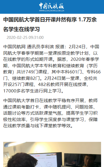 中国民航大学首日在线教学平稳有序开展,教师通过课前考勤打卡,课中随机提问、问题抢答、话题讨论等方式活跃课堂气氛,提高学生学习积极性和效率,引导学生深度参与课堂学习,保障在线教学质量与线下课堂教学等效。