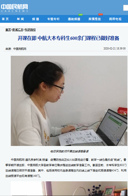 中国民航网 通讯员李利滨 报道:疫情防控战正如火如荼地进行着,教学一线也是抗疫“前线”。春季学期开课在即,中国民航大学各教学单位稳步推进在线教学准备工作。截至目前,本专科学生603门在线课程已做好开课准备,其中,包括使用校内自录课程在内的线上线下混合式授课课程454门,利用在线授课平台现有课程149门。