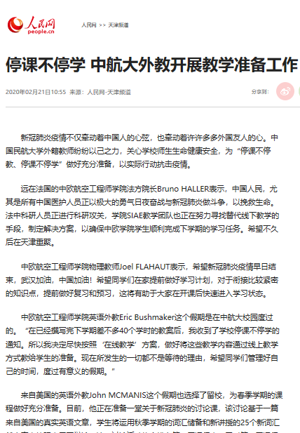 中欧航空工程师学院英语外教Eric Bushmaker这个假期是在中航大校园度过的。“在已经撰写完下学期差不多40个学时的教案后,我收到了学校停课不停学的通知。所以我决定尽快按照‘在线教学’方案,做好将这些教学内容通过线上教学方式教给学生的准备。现在所发生的一切都不是等待的理由,希望同学们管理好自己的时间,度过有意义的假期。”