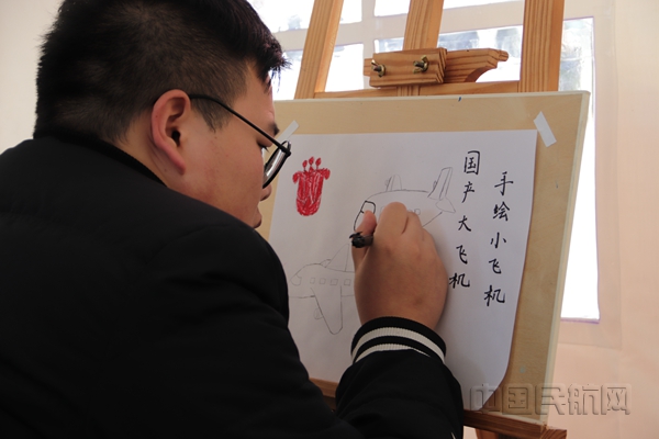 中航大学生现场画出国产大飞机(李雄/摄)