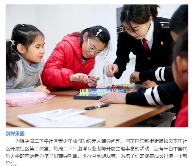 为解决周二下午社区青少年放假功课无人辅导问题,河东区东新街街道松风东里社区开展社区第二课堂,每周二下午邀请专业老师开展主题丰富的活动,还有来自中国民航大学的志愿者为孩子们辅导功课,进行互动游戏等,为孩子们的健康成长打造一个新平台。