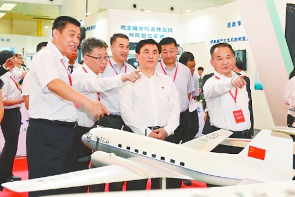 民航局局长冯正霖,副局长董志毅、王志清、吕尔学参观展览。 本报记者 张哈斯巴根 摄