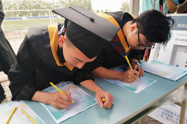 近日,以“奋进万里蓝天·‘准民航人’启航”为主题的中国民航大学2018年毕业季活动举行。在活动现场,毕业生可以给2035年的自己写信,主办方将保管信件,并在未来每隔五年联系写信人询问信件是否寄出,直至2035年寄出所有信件。(傅舸)