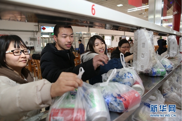 2月15日,中国民航大学在北院航一食堂为寒假留校师生共庆新春佳节,这是留校学生领取午餐现场。新华网发(庞杰 摄)
