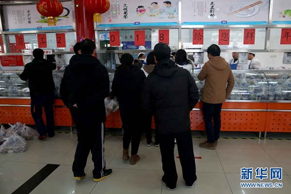 2月15日,中国民航大学在北院航一食堂为寒假留校师生共庆新春佳节,这是师生领取午餐现场。新华网发(庞杰 摄)