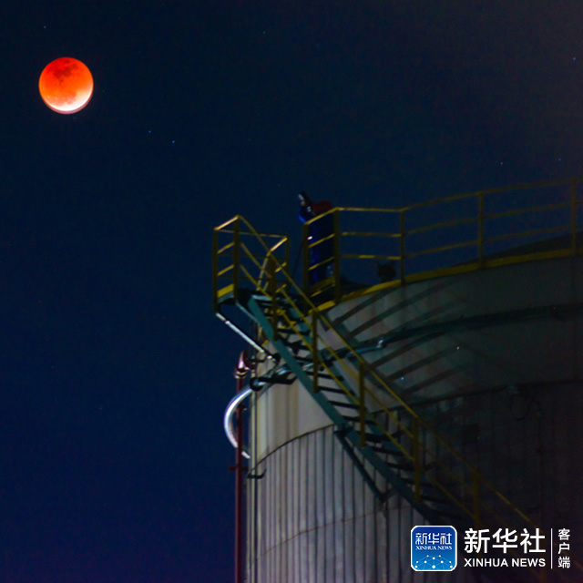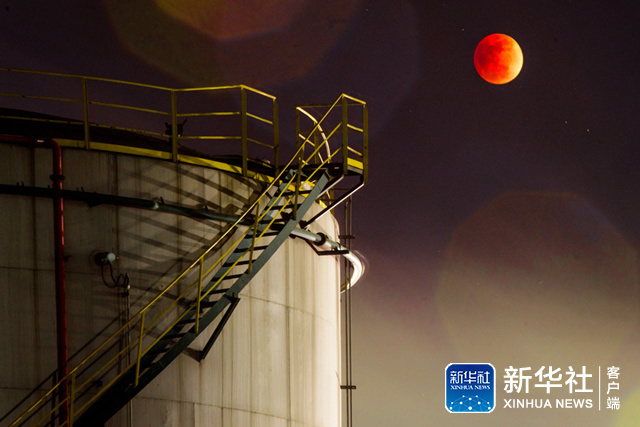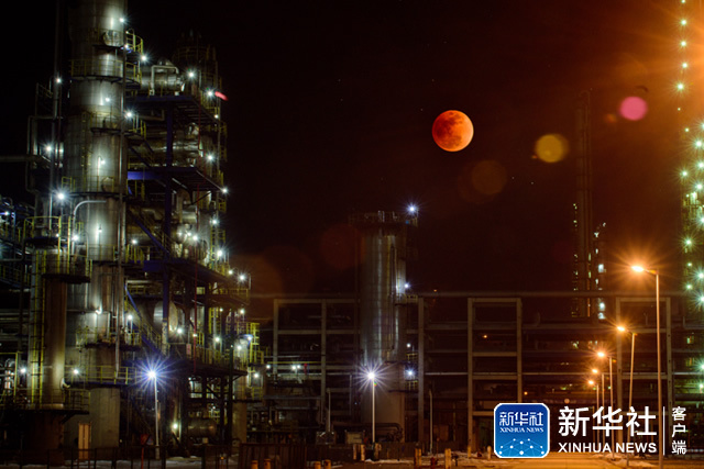 ↑这是1月31日在天津石化厂区拍摄的月食。(新华视觉 李荣荣 摄)
