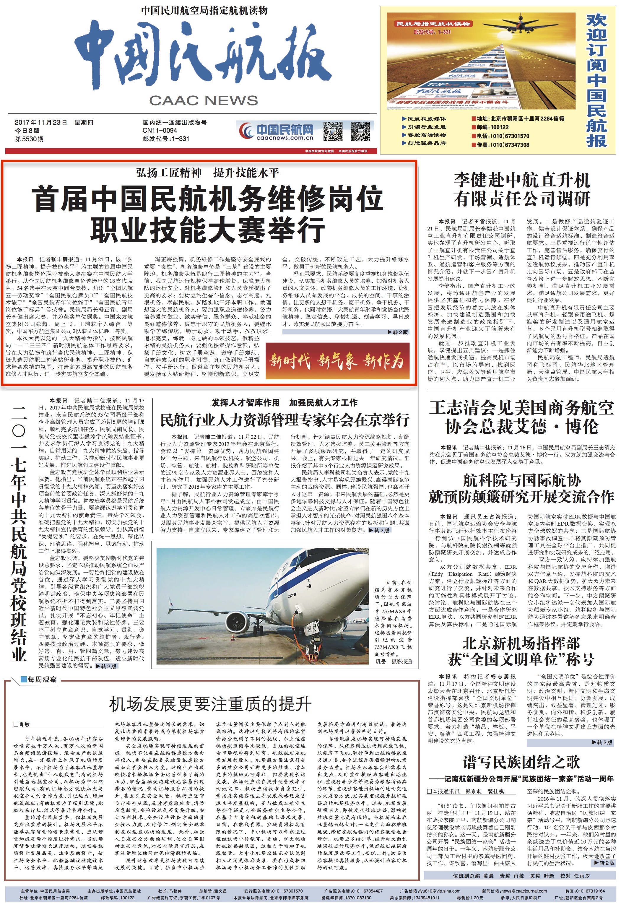 本报讯 记者张丰蘩报道:11月21日,以“弘扬工匠精神,提升技能水平”为主题的首届中国民航机务维修岗位职业技能大赛决赛在中国民航大学举行。从全国民航机务维修单位遴选出的18支代表队、54名选手在大赛中同台竞技,角逐“全国民航五一劳动奖章”“全国民航金牌员工”“全国民航技术能手”“全国民航青年岗位能手”“全国民航青年岗位能手标兵”等荣誉。民航局局长冯正霖、副局长李健出席大赛,并为获奖单位颁奖。中国东方航空集团公司张超、周上飞、王玮获个人综合一等奖,中国东方航空集团公司2队获团体优胜一等奖。