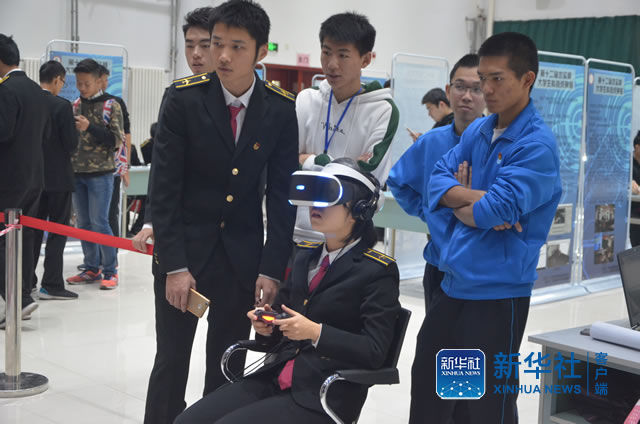 11月12日,中国民航大学举办第十二届“求实杯”科技成果展,图为参观展览的同学体验VR技术。