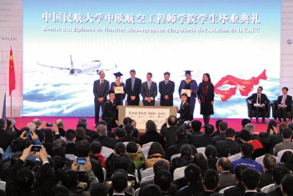 2015年1月,时任法国总理曼努埃尔·瓦尔斯(中)在中国民航大学中欧航空工程师学院学生毕业典礼上致辞,并为学生颁发毕业证书。