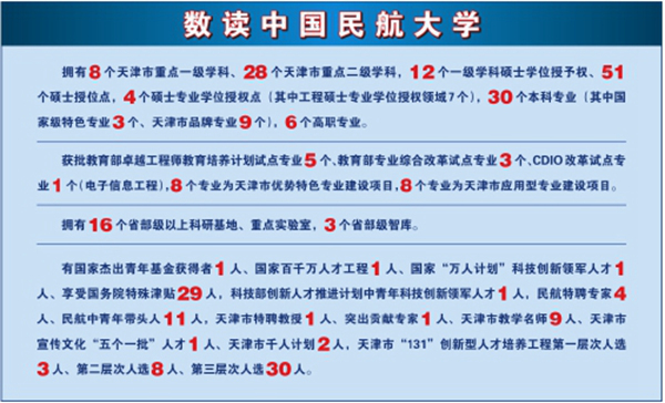 创新引领是一流大学的共同特征,一流的大学又以培养一流的人才为己任。为此,中国民航大学建立了鲜明的创新人才培养体系,促进教学转型升级和人才培养质量提高。与此同时,中国民航大学紧密对接民航事业,搭建了较为健全、协调发展的民航特色专业框架,构建了与民航发展领域相匹配的新型学科体系,学科建设涵盖民航发展各个门类。