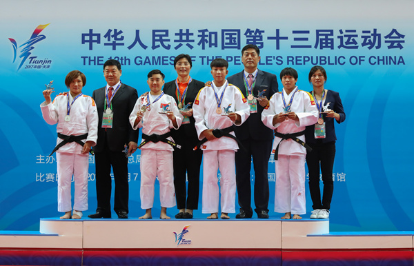 8月7日,第十三届全运会柔道比赛项目在中国民航大学体育馆开赛。来自全国各地的29支队伍展开激烈角逐,观众热情高涨。天津队队员徐凤、邳苏杰夺得女子—52公斤级铜牌。中国民航大学党委书记景一宏、党委副书记于剑,作为嘉宾为获奖选手颁发“津”字纪念牌。