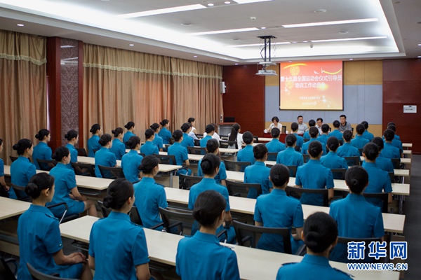 6月14日,在第十三届全运会仪式引导员培训动员会现场,50名中国民航大学乘务学院学生坐姿整齐。新华网发(陈红叶 摄)