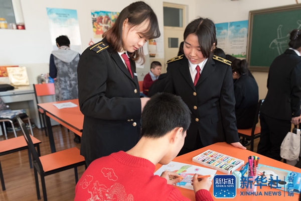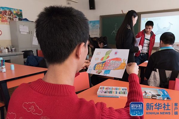 2017年3月31日,中国民航大学与天津河东启智学校共建“星星计划”公益实践基地,中航大学生志愿者引导孩子们画出自己心中的世界。