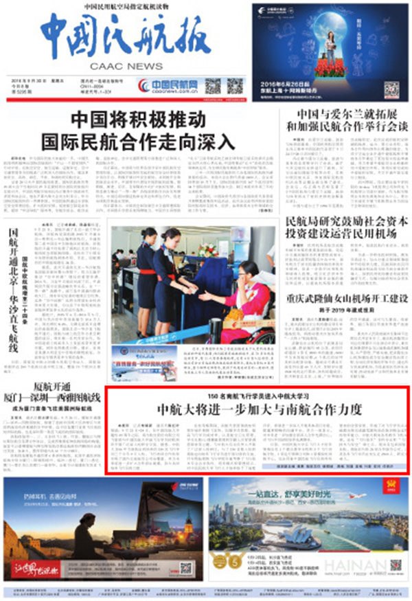 《中国民航报》头版:中航大将进一步加大与南航合作力度