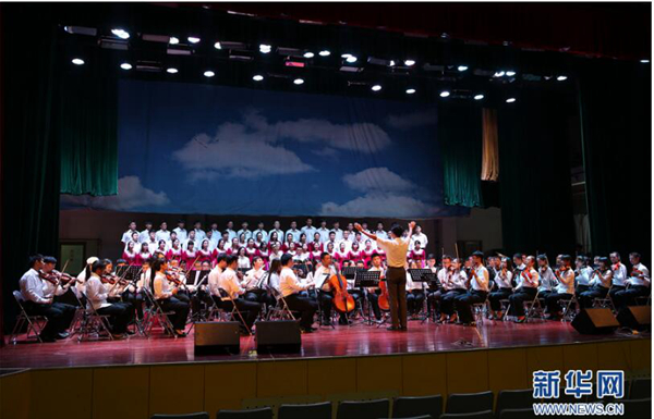 9月12日,中国民航大学校庆65周年晚会彩排在北院礼堂举行,学生军乐团合唱团联合演出《二十年后再相会》。新华网发(庞杰 摄)