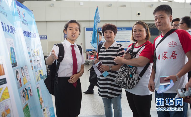 8月19日,中国民航大学大学生记者团暑期社会实践队成员为游客讲解漫画中涉及的出入境知识。新华网发(陈红叶 摄)