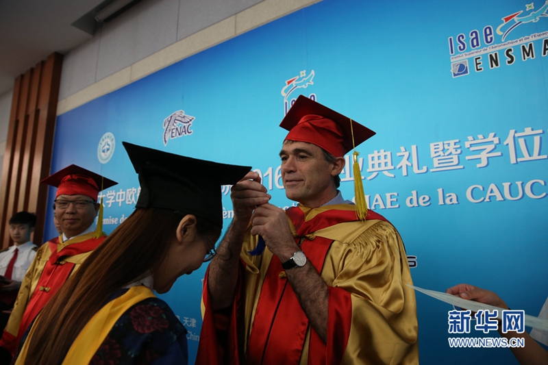 6月26日,在该校中欧航空工程师学院一楼会议室,法国国立民航大学校长马克·瓦拉为中欧航空工程师学院学生拨穗。新华网发(庞杰 摄)