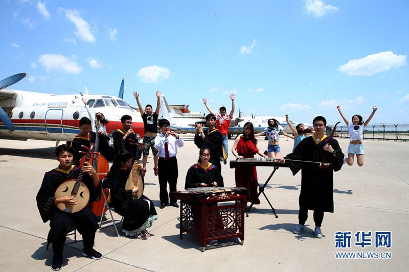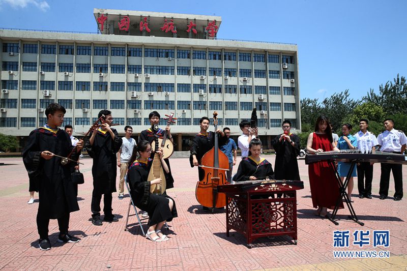 6月15日,中国民航大学2016届民乐团的毕业生们在北院工程技术训练中心停机坪的飞机前以及北校区北一教学楼前广场演奏中国古典乐曲,以此告别多姿多彩的4年大学生活。