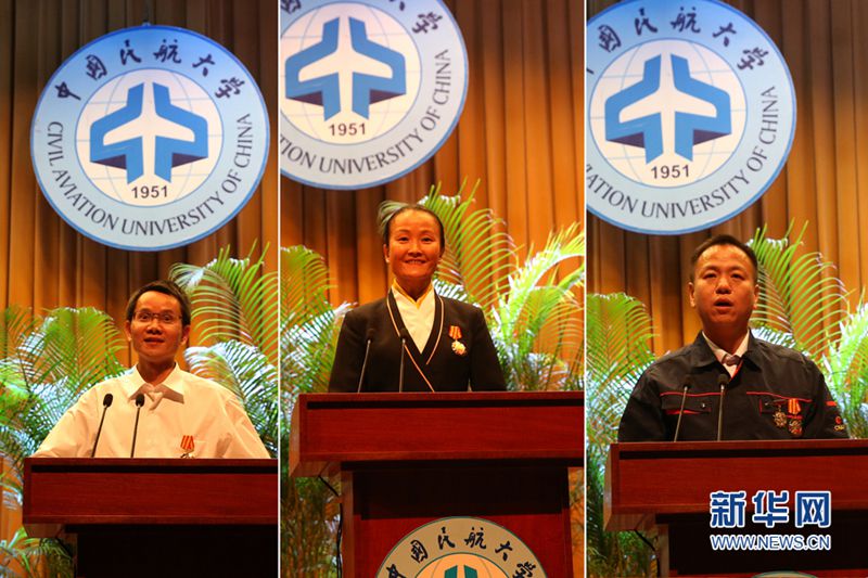 5月27日,来自全国民航的3位劳动模范代表进行演讲(拼版照片),他们分别是获得全国五一劳动奖章、北京飞机维修工程公司成都分公司倪泽军(左);获得全国五一劳动奖章、中国南方航空公司广州营业部区绯(中);全国劳模、党的十八大代表、中国航油河北分公司吴志梁(右)。新华网发(庞杰 摄)