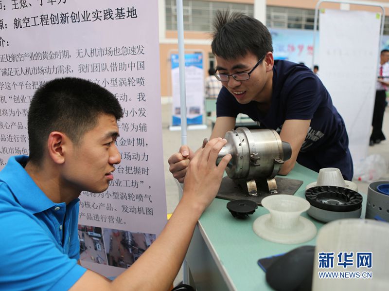 5月6日,科技创新成果展上,“小型涡轮喷气发动机‘研发与定制平台’”项目组与参观学生共同探讨设计思路。新华网发(陈红叶 摄)
