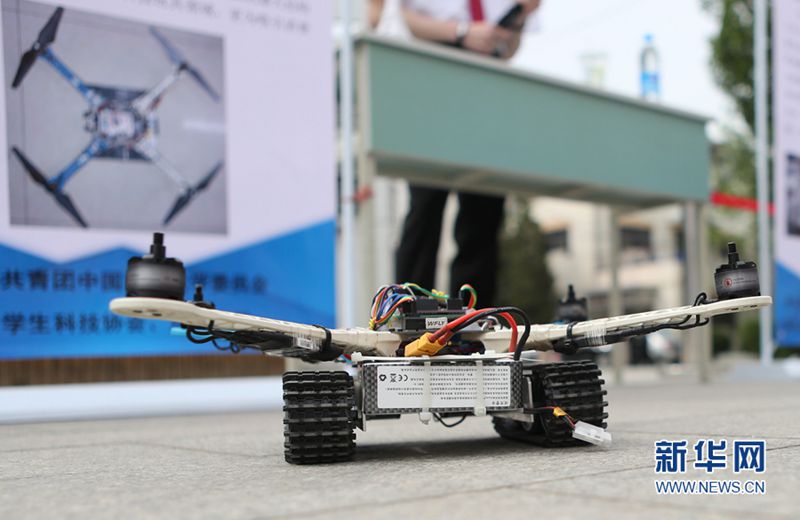 5月6日,科技创新成果展上展示的简易陆空两栖四旋翼机器人。新华网发(陈红叶 摄)
