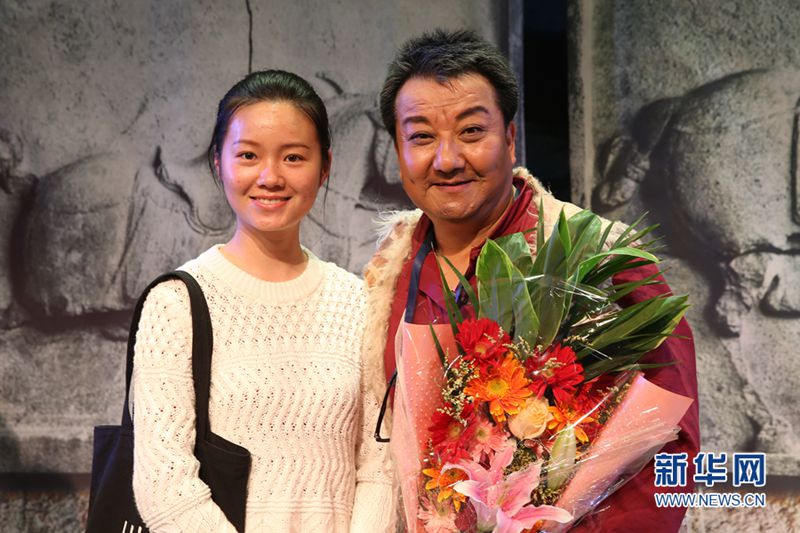 4月18日,秦腔现代戏《西京故事》领衔主演谭建勋与学生合影留念。新华网发(庞杰 摄)