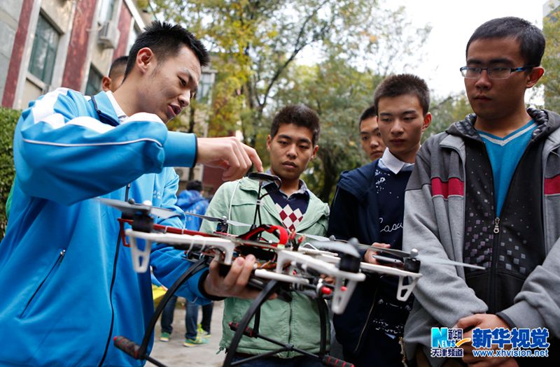 10月23日,中国民航大学航模队成员现场为2015级新生讲解无人机的构造和原理。(陈红叶 摄)