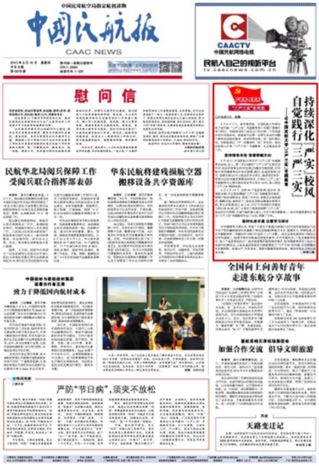 《中国民航报》1版:持续深化“严实”校风自觉践行“三严三实”——记中国民航大学“三严三实”专题教育