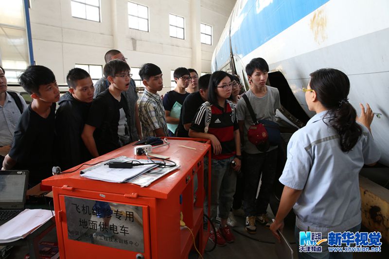 7月6日,台湾大学生在中国民航大学工程训练中心上飞机认知课