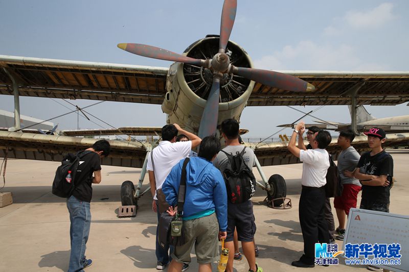 7月6日,台湾大学生在中国民航大学工程训练中心停机坪飞机上参观学习