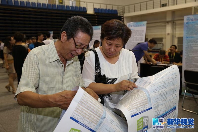 6月25日,在中国民航大学南校区体育馆,考生家长查阅招生简章