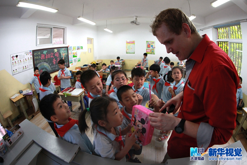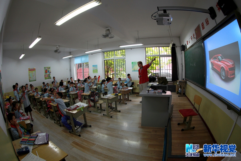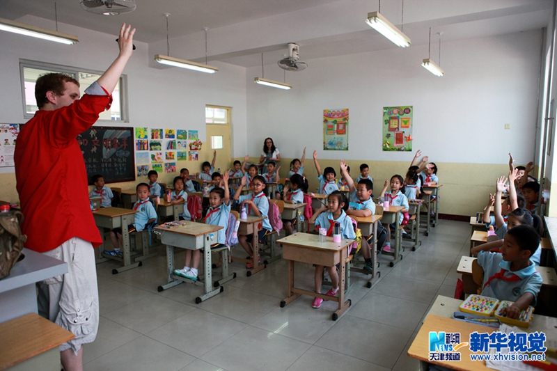 新华网天津6月10日电 为丰富课堂文化,提高学生英语口语水平,6月9日,美籍英语教师Devin Bennett为中国民航大学附属小学(河东区缘诚小学)一年级的同学们上了一堂生动活泼的英语口语课。据介绍,中国民航大学充分发挥外教资源优势,把开放的教学模式带入小学课堂,锻炼同学们的记忆能力和反应能力,为孩子们营造纯正英语教学的课堂氛围。