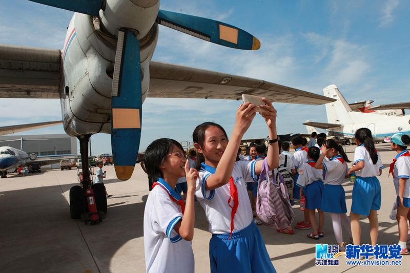6月2日,缘诚小学的学生们在北校区工程训练中心停机坪参观飞机并拍照留念