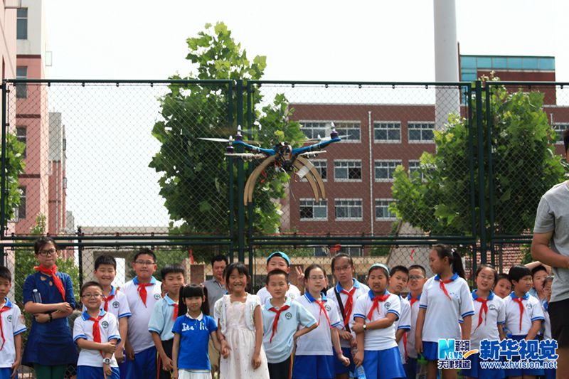 6月2日,学生航模队在北校区足球场为师生代表放飞无人机