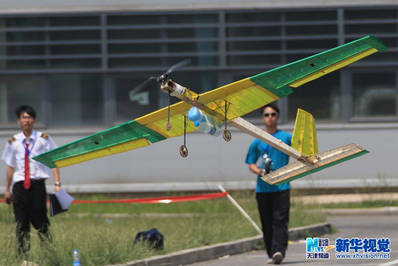 5月24日,在中国民航大学科技园,参加固定翼类比赛的选手起飞飞机(庞杰 摄)