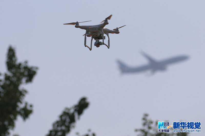 5月24日,在中国民航大学南院体育馆副馆,一架四轴航拍飞行器在进行展示飞行。(总汇 摄)
