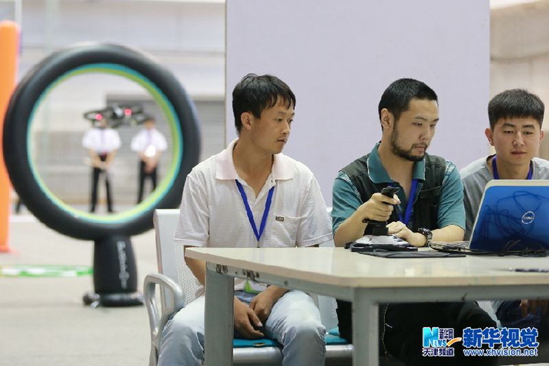 5月24日,在中国民航大学南院体育馆副馆举行的第一人称视角多旋翼飞机障碍赛上,选手背对场地操纵飞机穿越圆环。(总汇 摄)