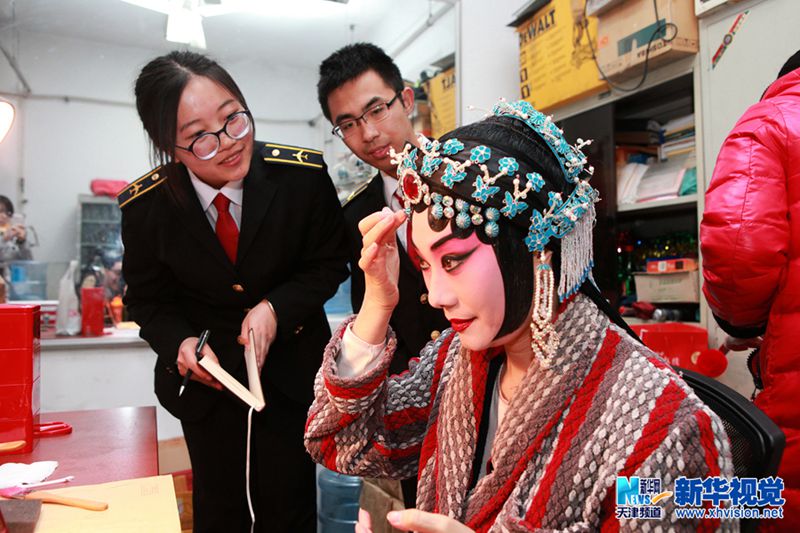 4月14日,中国民航大学学生与国家京剧院演员在后台进行交流