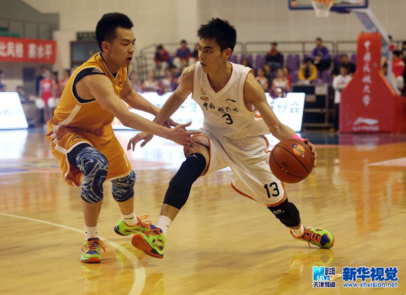 4月9日,在开幕式之后的比赛中,中国民航大学队13号贾明儒带球突破。(刘东岳 摄)