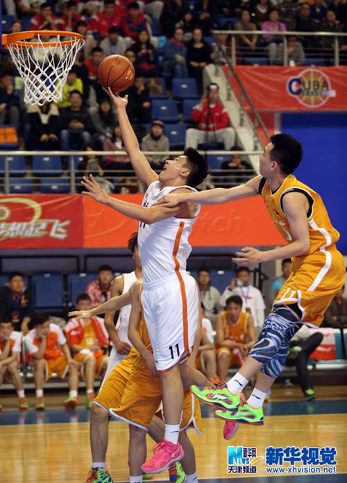 4月9日,在开幕式之后的比赛中,中国民航大学队11号孙硕(中)突破上篮。(刘东岳 摄)