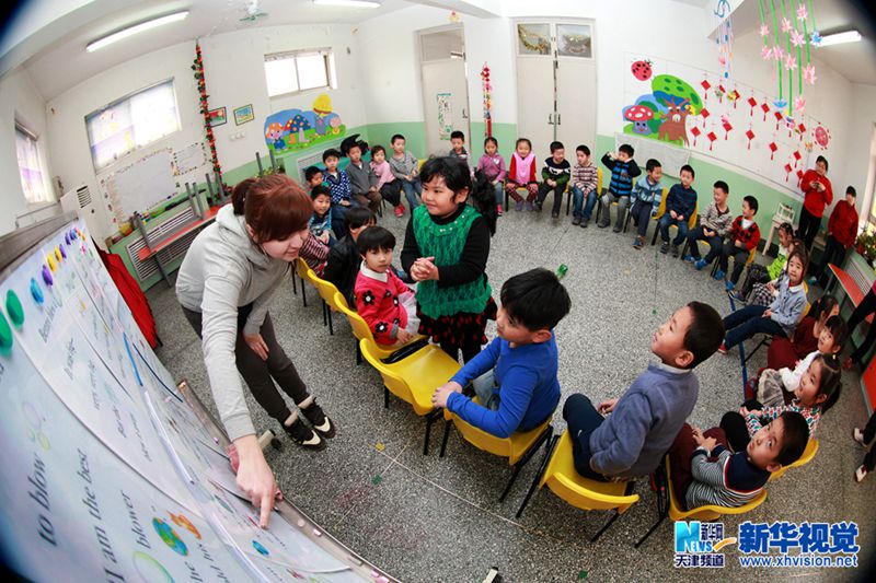 3月18日,在中国民航大学幼儿园内,老师为孩子们上英语课