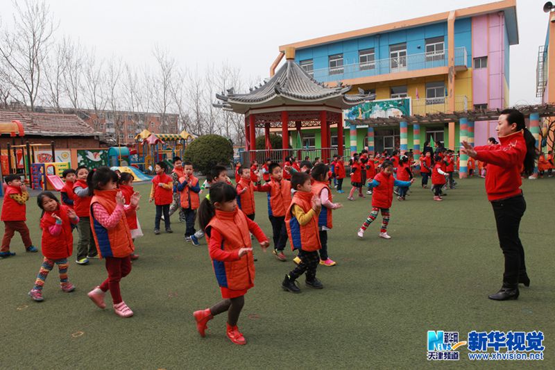 3月18日,在中国民航大学幼儿园内,儿童在老师的指导下进行户外运动