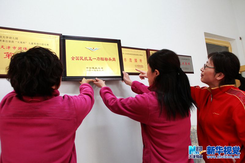 3月18日,在中国民航大学幼儿园内,老师们悬挂“全国民航五一巾帼标兵岗”荣誉奖章