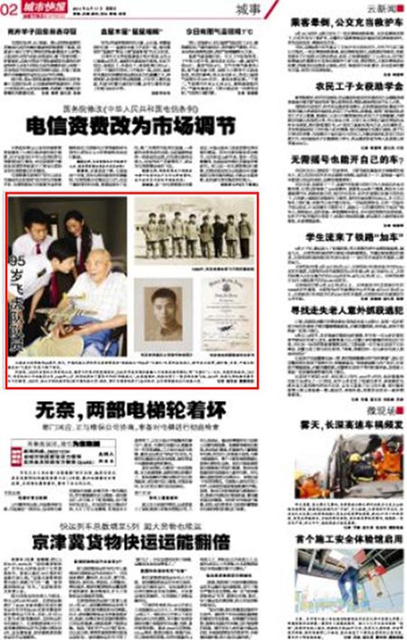 正值抗日战争胜利69周年。昨天,中国民航大学的学生看望曾参加“两航起义”的95岁“飞虎队”队员何其忱老人,聆听抗日故事。据介绍,目前,中国大陆健在的“飞虎队”队员只剩下两位。
