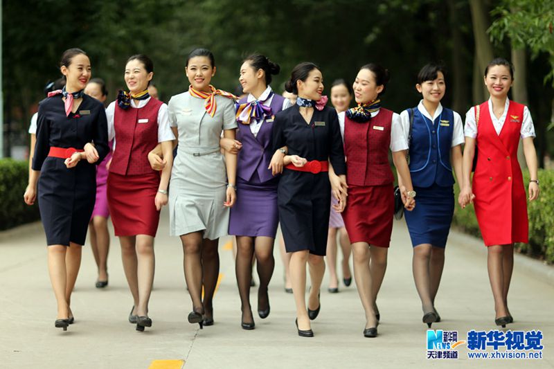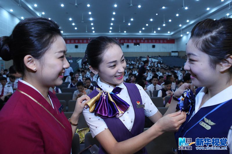 6月19日上午,毕业典礼前,毕业生们穿着自己所签航空公司乘务制服,准备迎来自己的毕业典礼