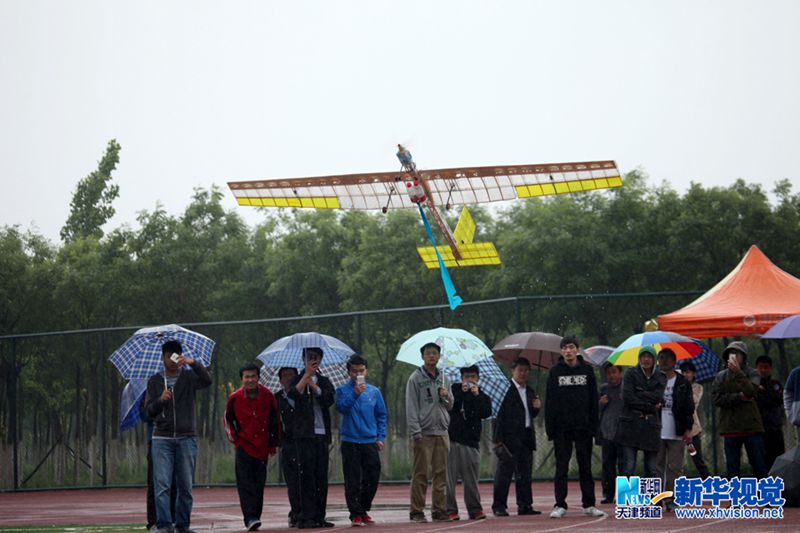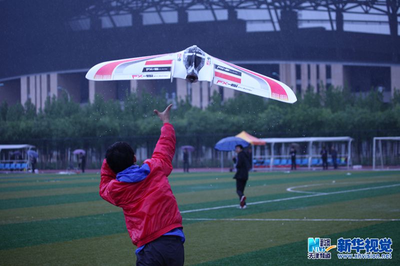 5月11日,比赛现场,参赛学生抛射固定翼飞机起飞
