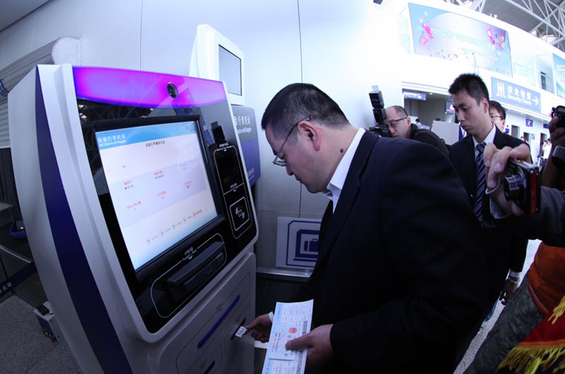 4月18日,乘客试用国内首款自助行李托运系统,刷身份证