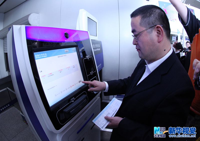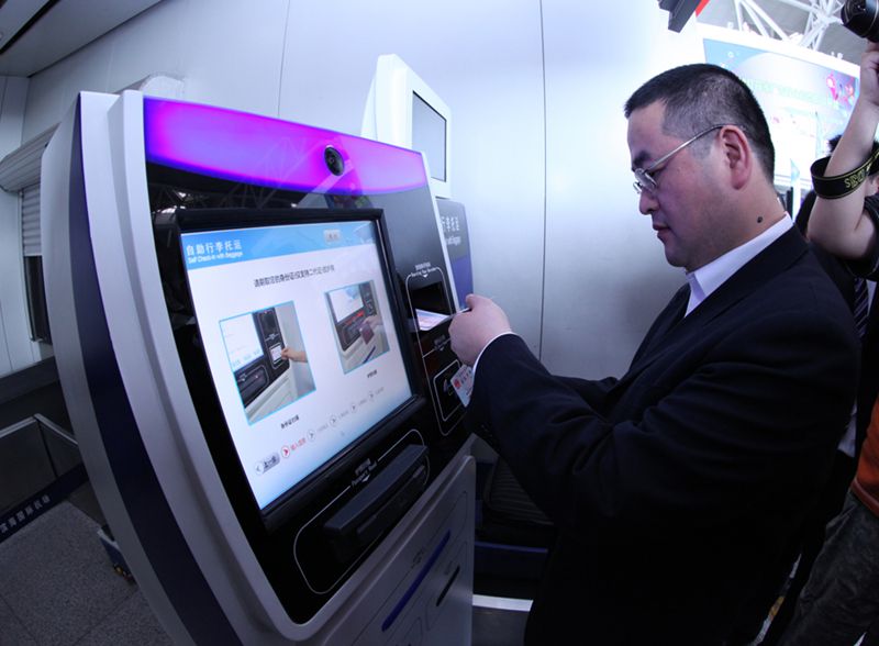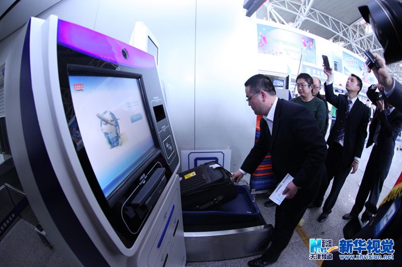 4月18日,乘客试用国内首款自助行李托运系统,刷登机牌